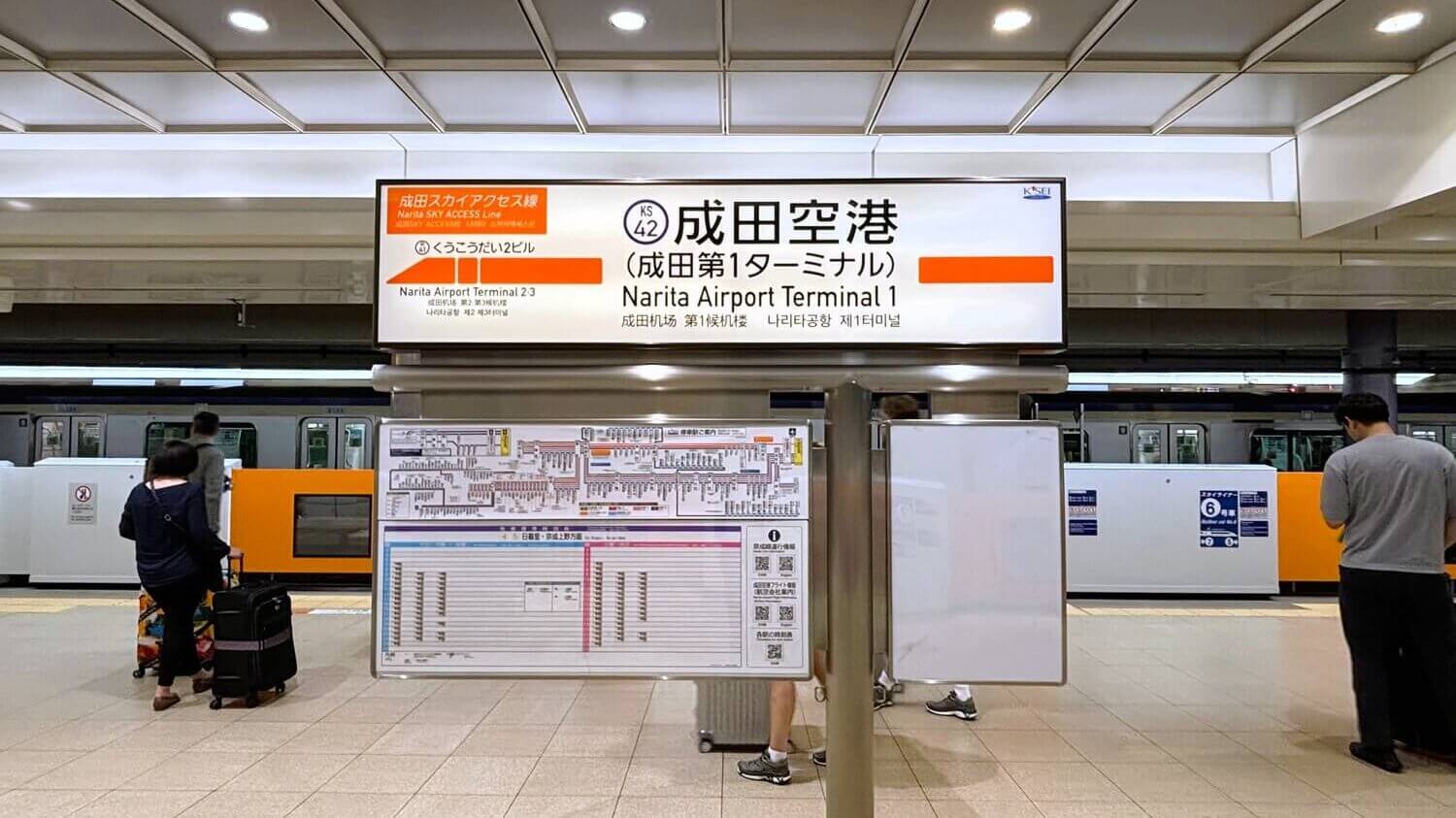 スカイライナーは「成田スカイアクセス線」を経由するため、オレンジ色の案内が目印になります。