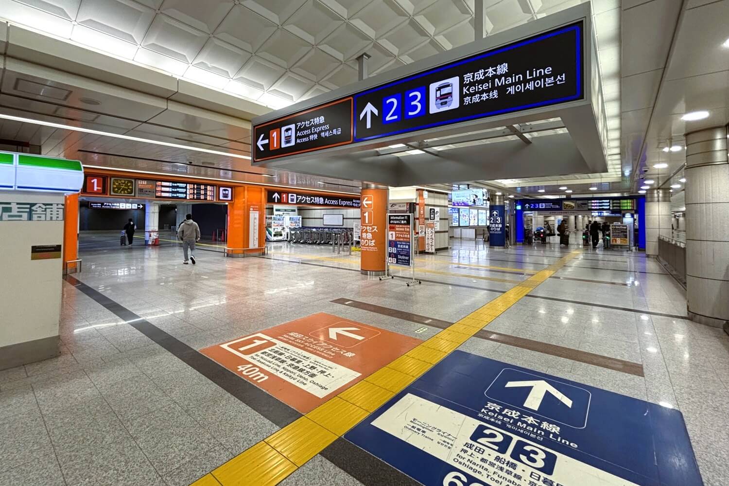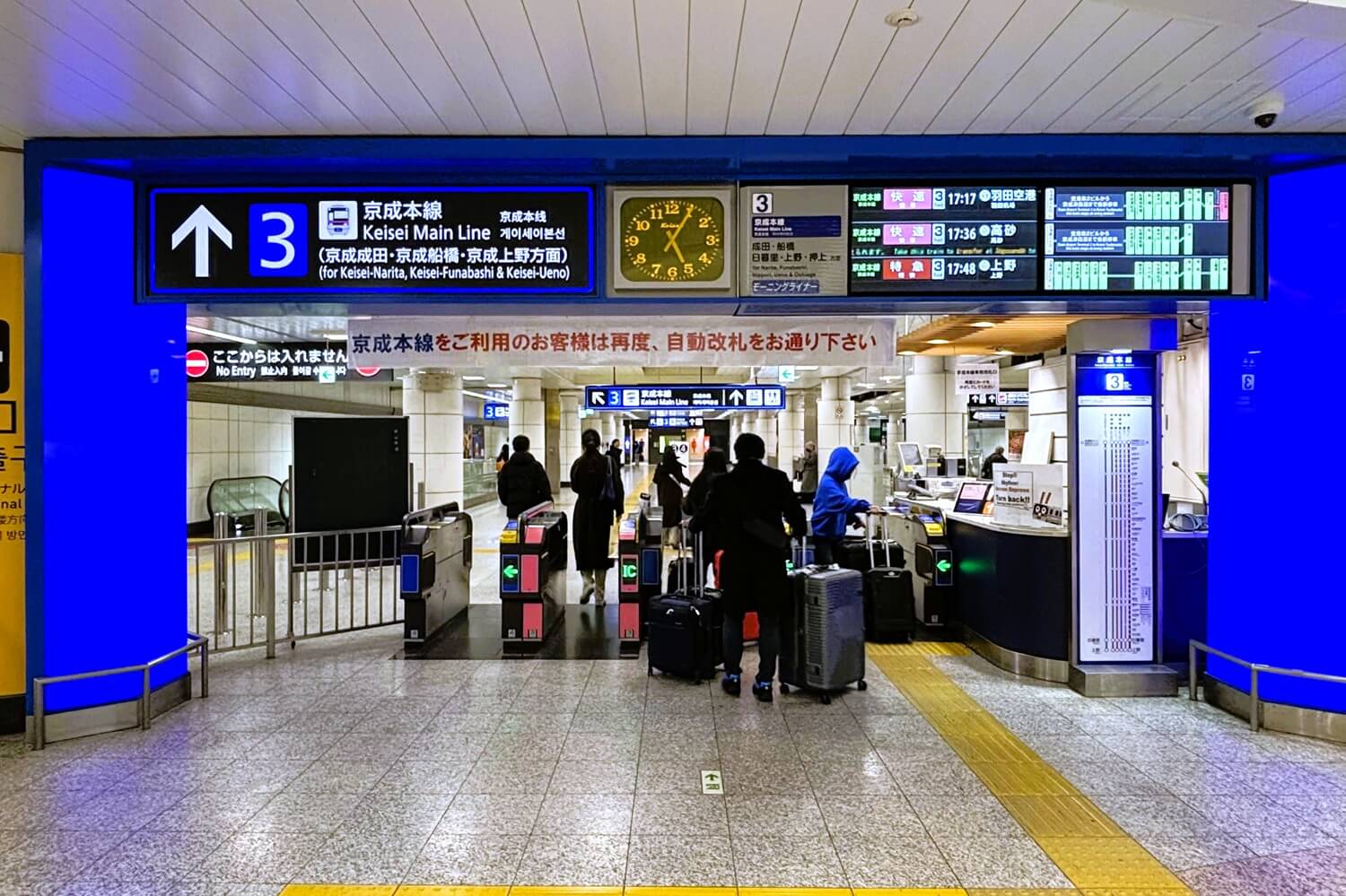 スカイライナーに乗りたくて、「藍色(濃いブルー)」を目印にして進むと… スカイライナーのりばへの「オレンジ色のゲート」をスルーしてしまい、すぐ隣にある似たようなブルーの「京成本線」の方へ進んでしまいます。