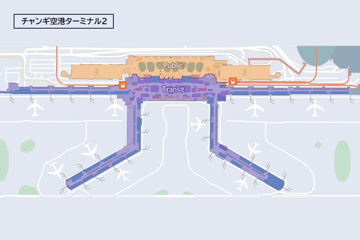 チャンギ空港のターミナル2(T2)は、横に長く広がる構造が特徴のターミナルです。中央に大きな共用エリアがあり、そこから4方向に搭乗ゲートが延びているため、端から端まで移動すると20分以上かかります。