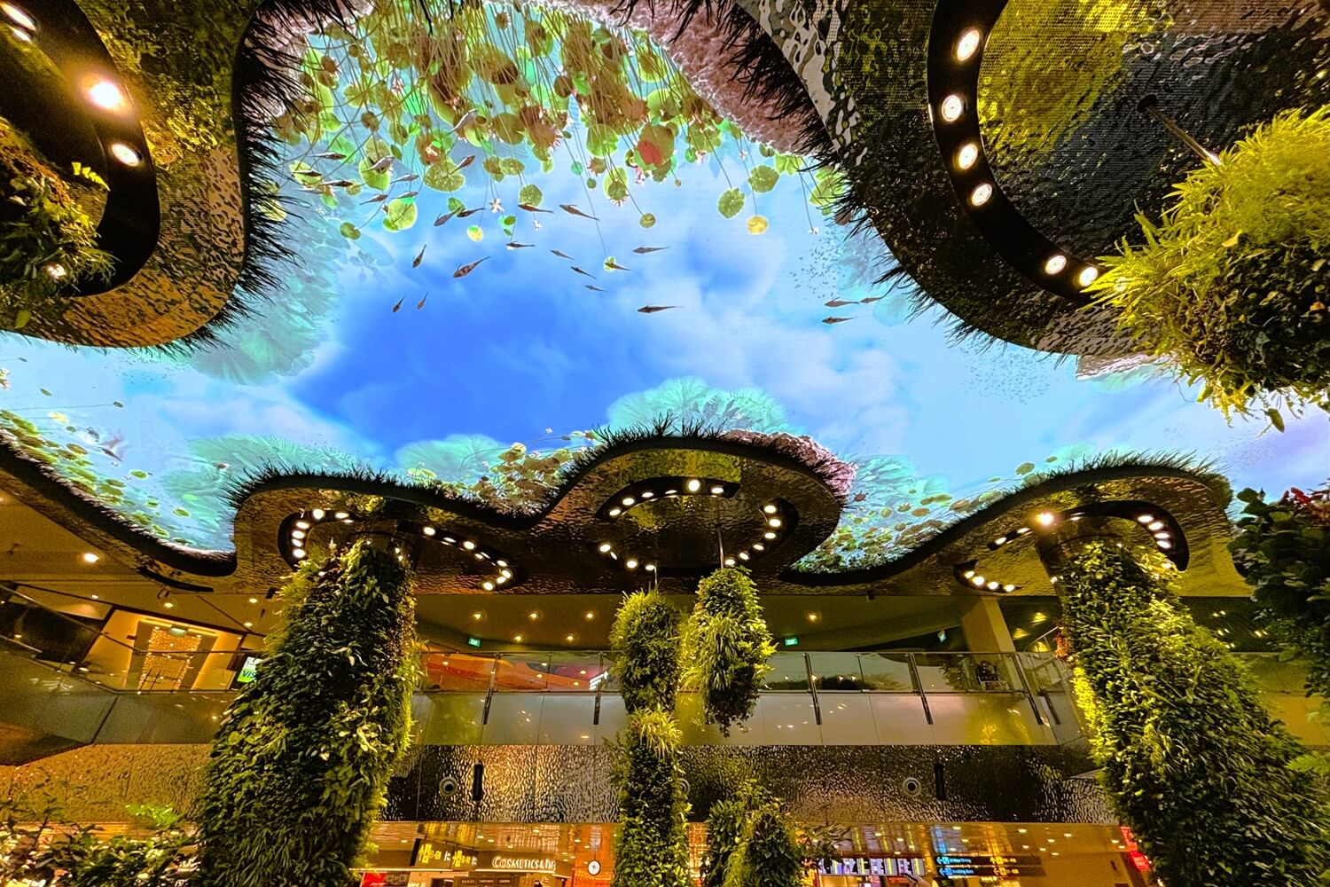 出国審査前に見ておきたいのが、T2にあるプロジェクションマッピングの巨大な滝「The Wonderfall」。高さ14メートルあり、映像のリアルさも相まって、近くで見ると意外なほど迫力があります。