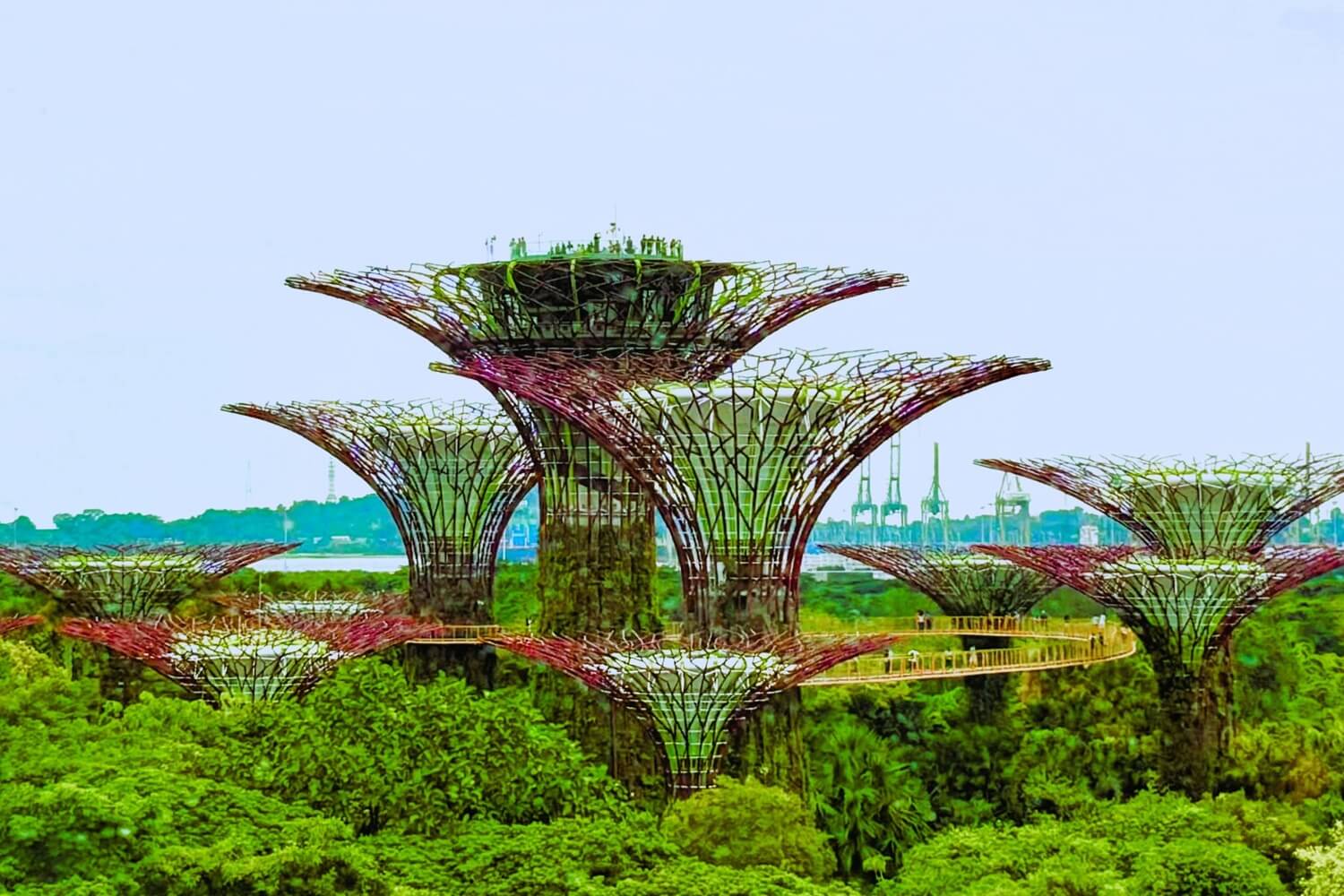 スーパーツリーグローブ(Supertree Grove)は、シンガポール最大級の植物園「ガーデンズ・バイ・ザ・ベイ」の中心にあるシンボル的な建造物。