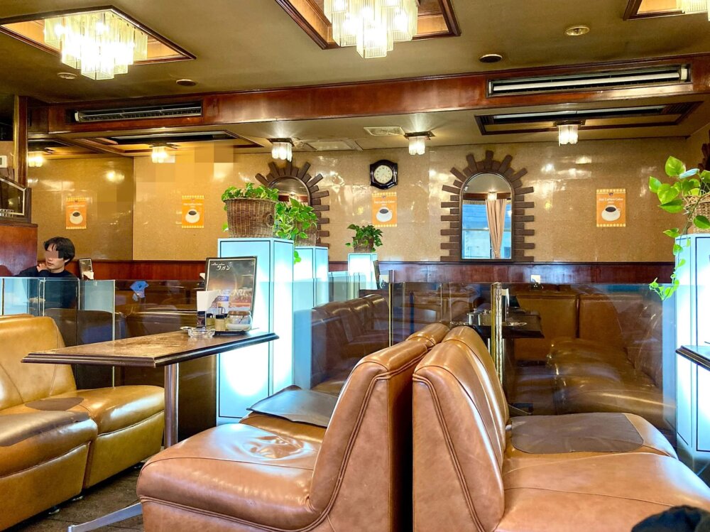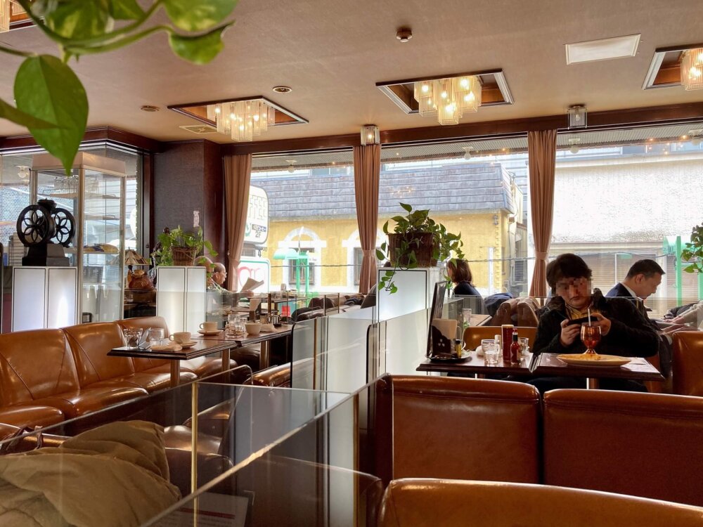 店内に入ると広く、窓が大きくて明るい空間です。昭和レトロを感じさせる装飾、余裕をもって並ぶソファー、ところどころ継ぎはぎなところも含めて、このまったり空間がなんとも心地よいです。