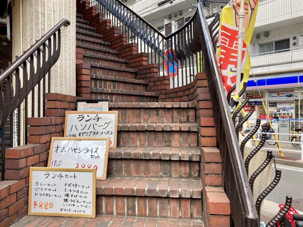 サガンさんのある2階へと上がる階段にはメニューが置いてあり、まるでアトラクション乗り場へ行くかのようにワクワクします。