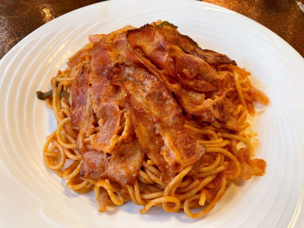 ちなみに、別日にいただいたのですが、ナポリタンもおすすめです。こちらもど~ん!とやってきます。ベーコンで覆いつくされてます!しっかりこってりがうまい、やみつきになる昭和のナポリタンです。
